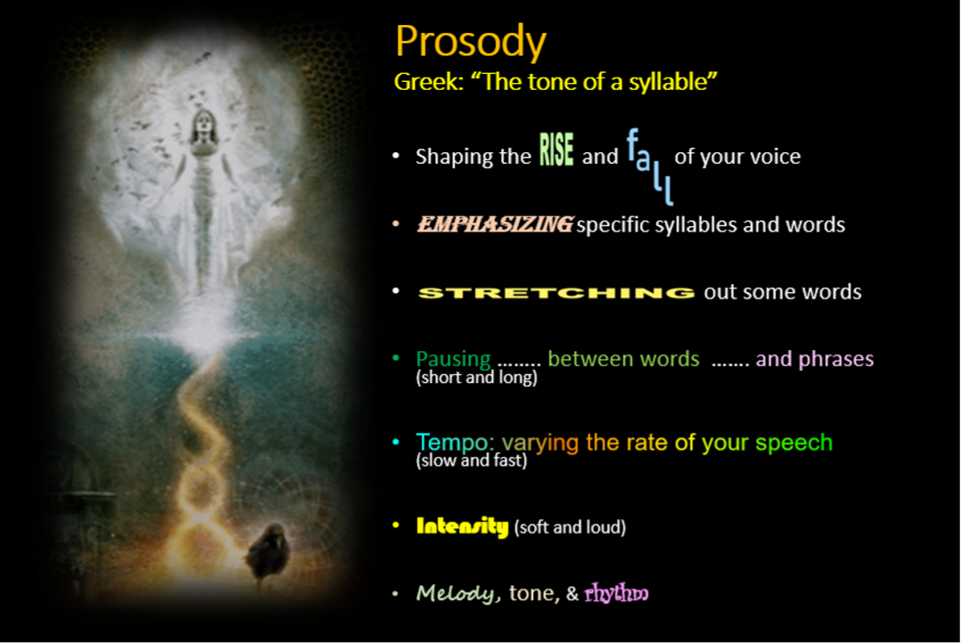 Prosody is essential to integrate the different language centers located in each hemisphere, and poetic speaking and writing (fiction or nonfiction) can rapidly reduce anxiety, depression, and even post-traumatic stress. Here is a list of the key components that we should practice, and to find ways to integrate these spoken qualities into our writing.