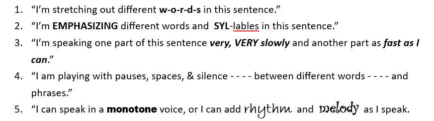 At our July 2nd “Writers in the Gallery” gathering, I presented the latest discoveries showing that we are all born with a brain that is built to communicate melodically, and if you don’t include prosody when you speak – varying the tone and rate and intensity of your voice, emphasizing specific words and syllables, strategically using pauses and silence, etc. – the listener’s brain will not discern the meaning and emotional quality that you wish to convey.